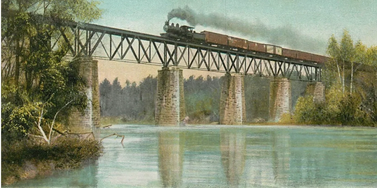 Header "Train" - Raphael Tuck & Son’s Post Card Series No. 2438, “Atlanta, GA. Art Publisher to their Majesties the King and Queen. The Western & Atlantic R. R. Bridge Over Chattahoochee River is eight miles out of Atlanta, and was built in 1850 at a cost to the State of $7,000,000. The Railroad, 139 miles in extent, is the main highway between the Ohio Valley and the South Atlantic Coast; it was the objective point of Sherman’s bloody and victorious campaign in 1864.